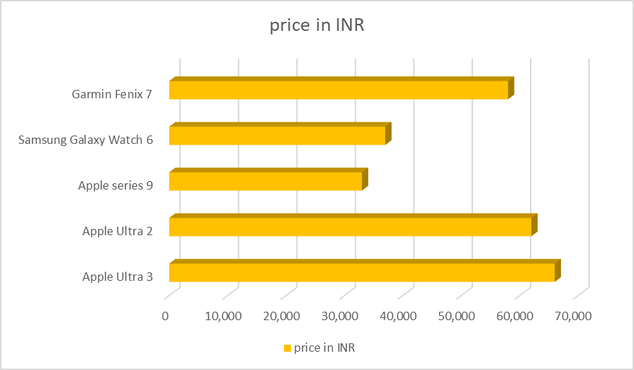 Overall, the chart shows a clear pricing structure in India’s smartwatch market, ranging from budget-friendly options to premium devices filled with features. The bar chart shows the price range of popular smartwatches available in India.
