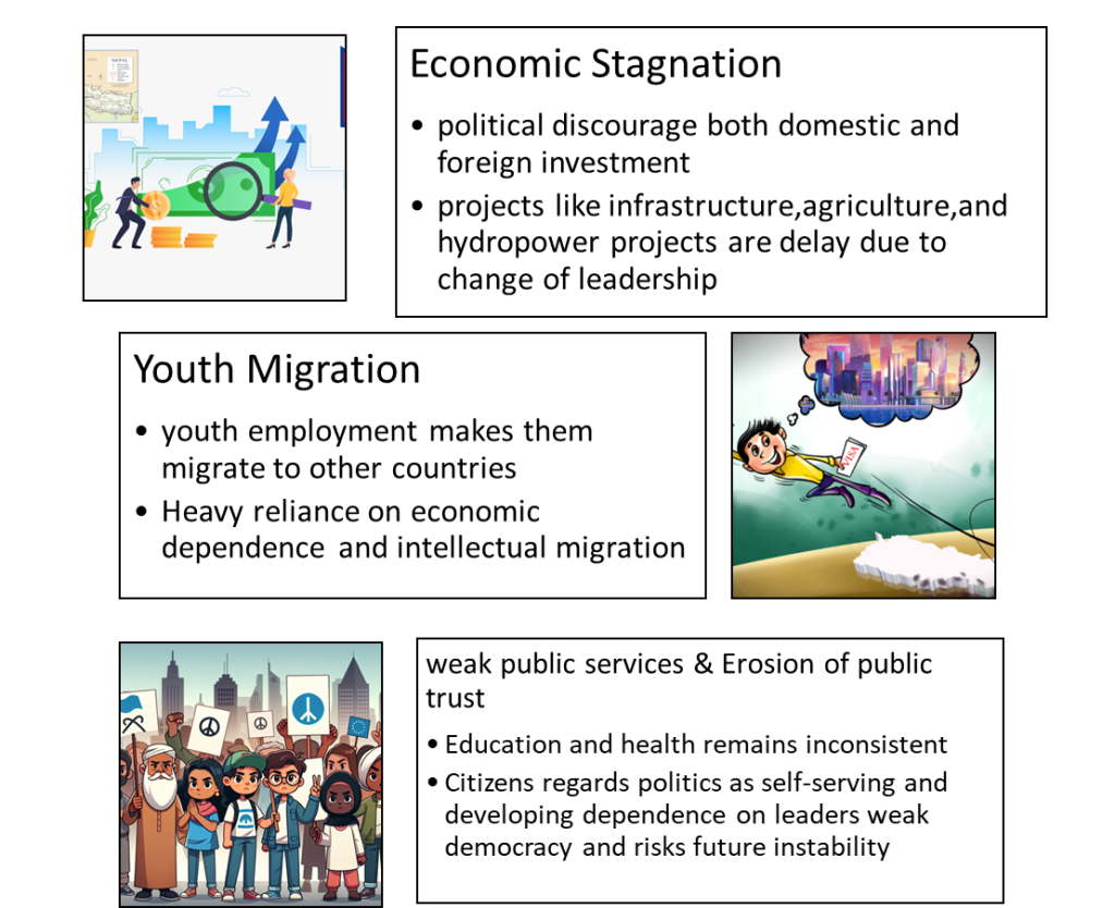 In Nepal, political leader focus on holding the power more than serving the people, instead of working together for the country’s growth. they often caught up by personal and party rivalries, other internal disputes, breaking or forming alliance, it creates a great impact in reforms and development projects that is left unfinished.as a result citizen lose their trust in their leaders and the systems.