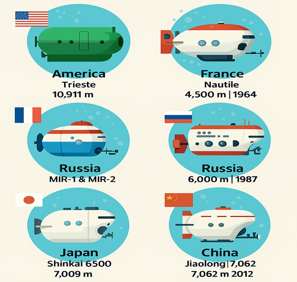 • Japan’s Shinkai 6500 is Submersible that can dive up to a depth of 6,500 metres. The recent scientific discovery of  Bathylepeta wadatsumi snail, in 2025, during an ocean census expedition, deep-sea Ecosystem.
