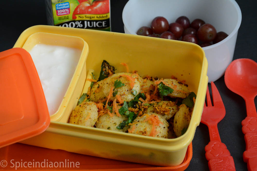 The tangy taste keeps it refreshing, even when eaten cold. It’s best for kids’ healthy lunch boxes with protein from fried ground nuts and spicy potatoes as a veggie.
